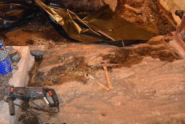 10/13/20 I was very surprised to discover that water was seeping out at the top of a high bedrock outcrop that I thought would always be high and dry. I could see that the water was going to run out in the direction toward the camera, but I wanted it to go the other way so that it could drain into an existing channel that you can barely see at the top of the picture. I used the Bosch Bulldog rotohammer to chisel a channel through the bedrock, alongside the concrete column pad, to get the water to run up into the drainage channel. I'll cover the entire outcropping with plastic to keep the moisture contained.
