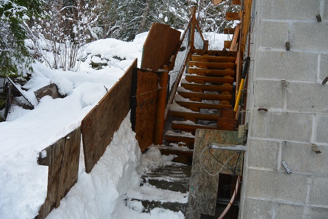 12/16/21 This winter, to save a lot of shoveling, I decided to set up a sheet of OSB against each of the newel posts at the foot of the front and back staircases. The sheets are intended to prevent the huge snow berm, that forms from snow falling off the roof, from avalanching down onto the stoop and the lower steps of the staircase. I had set those sheets up the previous week and they worked great. Now, however, the berms were high enough to overflow over the top of the OSB sheets. So, in the back, I added three more pieces of plywood on top of the OSB to stop the overflow. In this picture you can see the three additional sheets on top of the original OSB, and you can see the berm up against them.