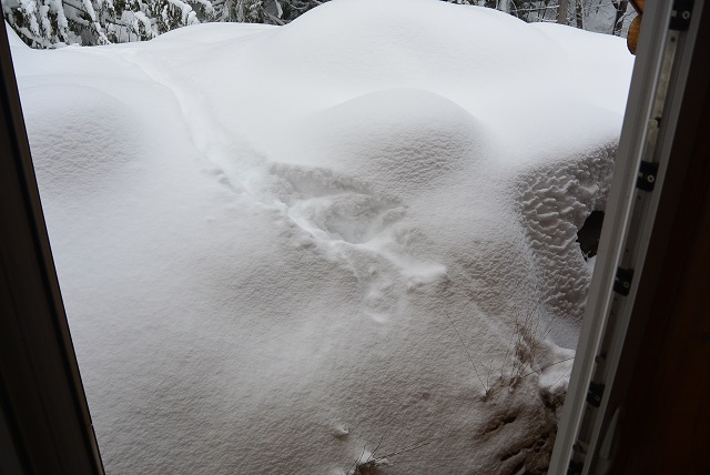 12/24/21 Here you can see where the cougar made his exit from the porch. There was barely enough room between the roof and the snow on the cliff for the cougar to climb and jump out leaving these tracks.