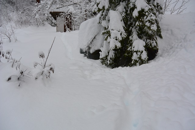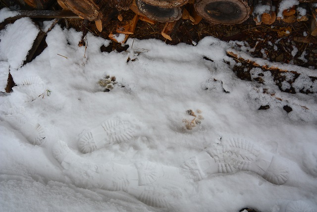 12/24/21 After looking around, I found many more sets of tracks. One set showed that the cougar had followed the trail in front of the cabin over to the trail leading to the hairpin turn. That part of the trail had been obliterated by a huge avalanche from the roof, but the trail in front of the cabin was clear as you can see from this picture in front of the woodpile. Another set of tracks showed that he had climbed all the way up the back stairs and across the back porch. I don't know where he went after that.