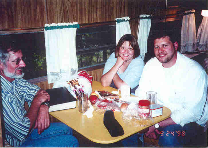 8/26/08 John and Harold in the cabin eating toasted English muffins with blackberry applesauce.