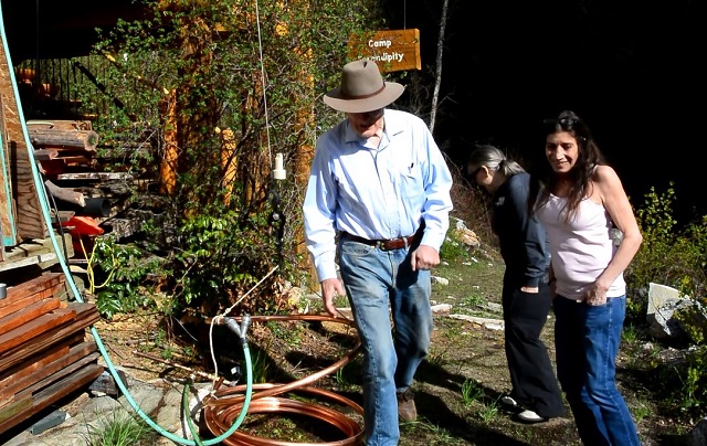 4/30/19 Marianne and Mylynda stopping by for a visit just as Paul is testing the hydraulic ram pump he made. The pump worked for the first time ever while they were watching.