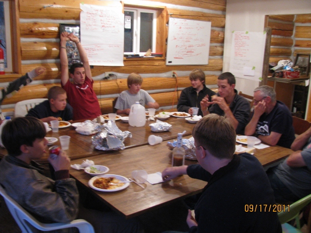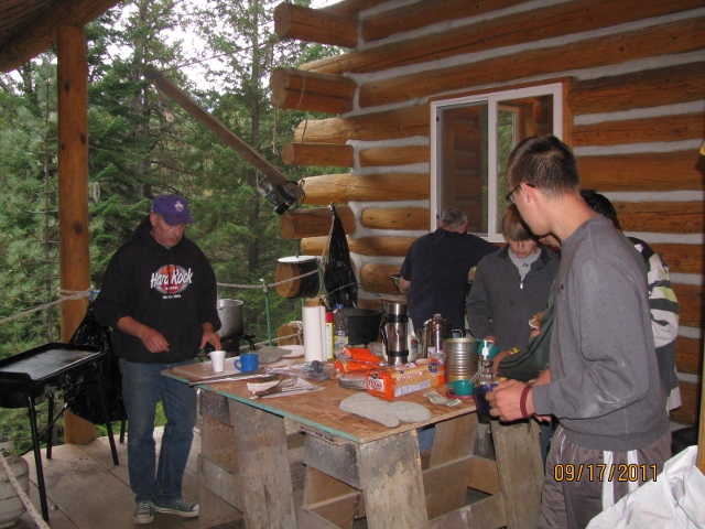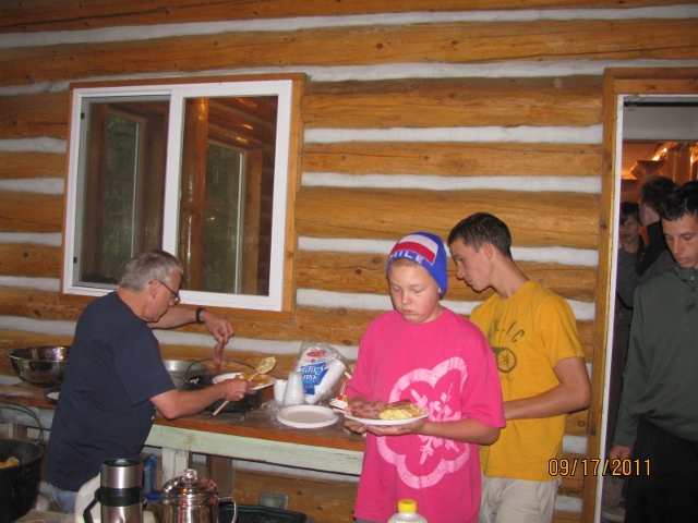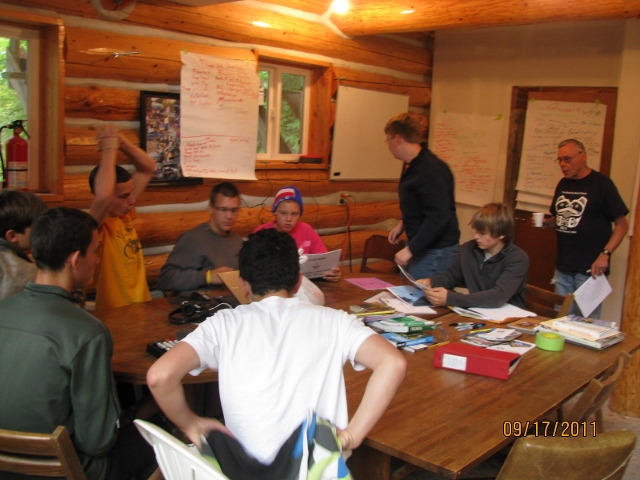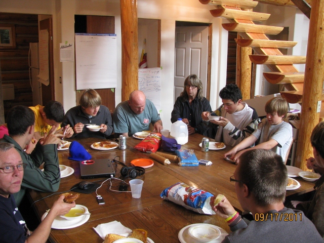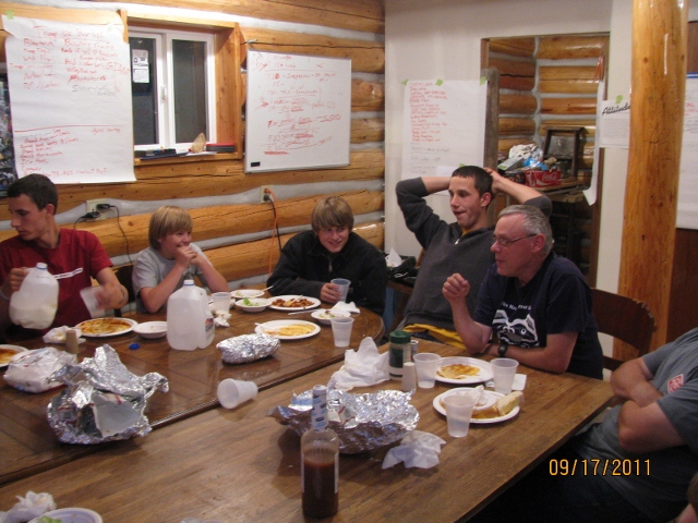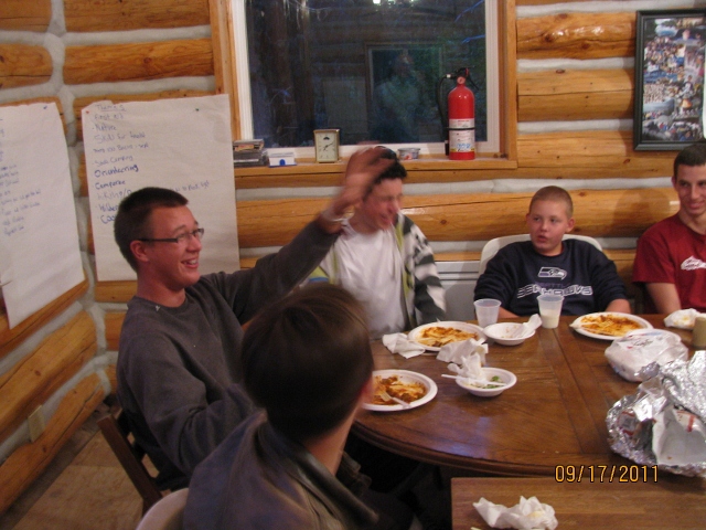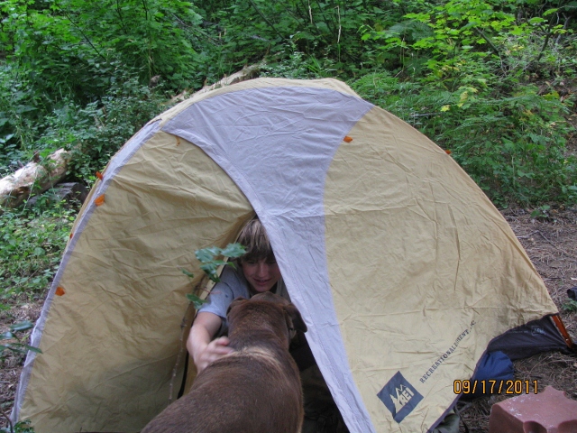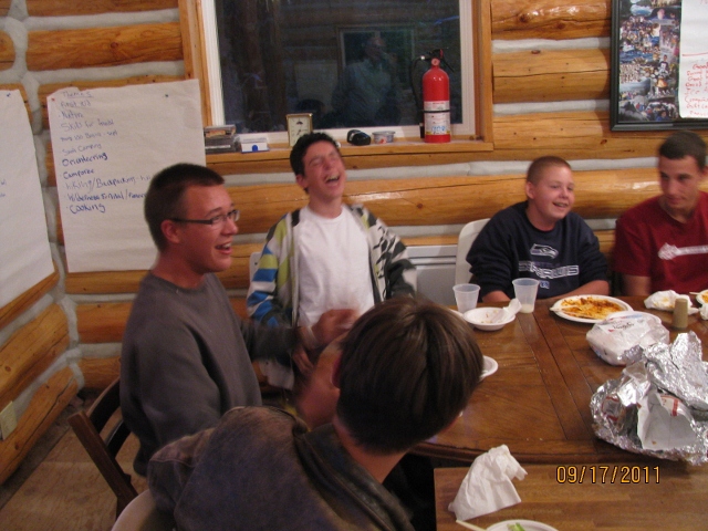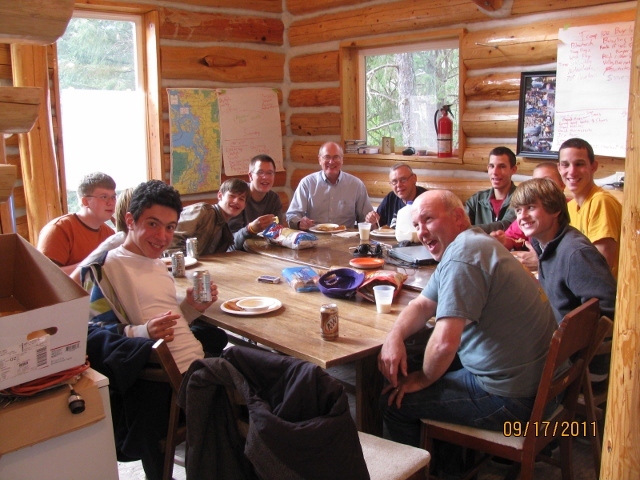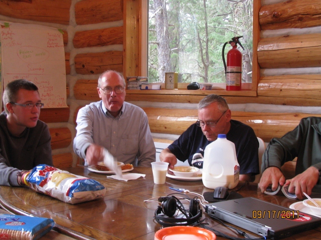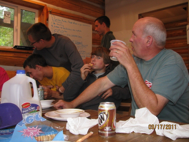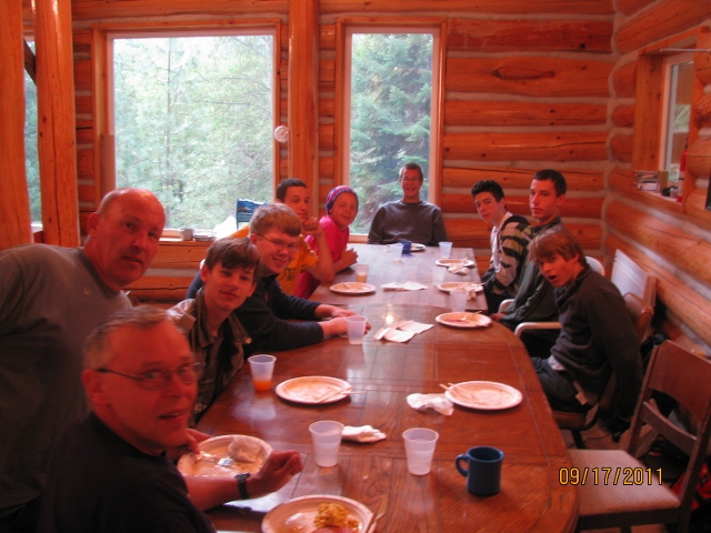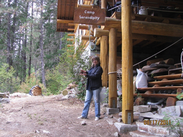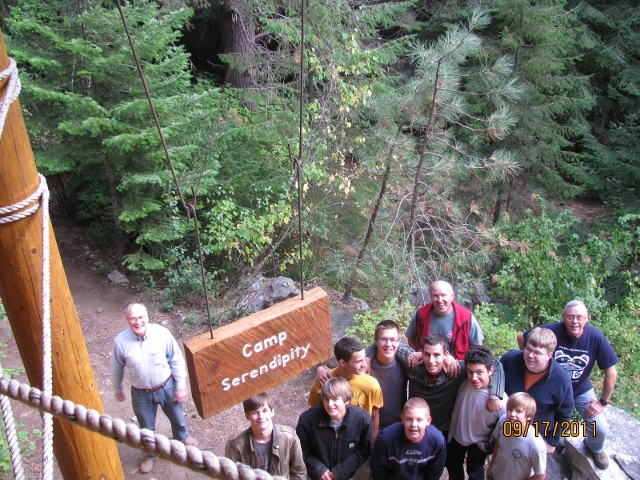 These pictures show some of the scenes from the 2011 fall planning session of Troop 100 from Ballard Washington. Paul Hendricks, the scoutmaster and superb chef, sets his kitchen up on the front porch of the cabin. Bill Dunnell, one of the troop bus drivers, helps with the cooking. Bert and Ernie made the rounds of the tents in the morning to wake the boys up. The boys did their planning inside the cabin but took breaks to do service projects around Camp Serendipity. They removed nails from boards and logs from the old trailer snow shelter, and they watered the giant sequoia trees. There was also some good story telling that had everyone laughing. It was a fun and productive weekend.