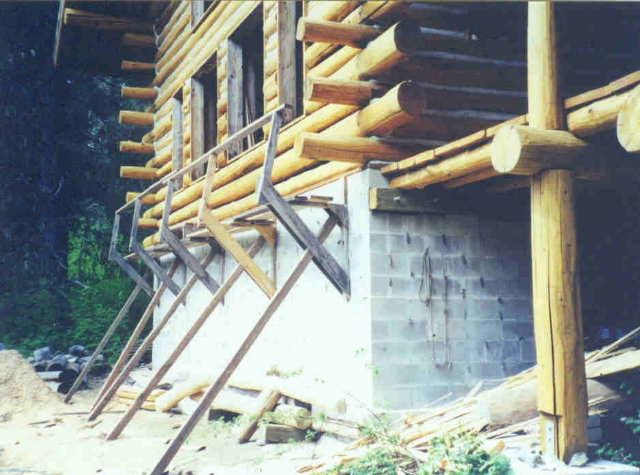 Once the walls were built, the same scaffold system was used on the outside of the building for staining and chinking. In the next picture, you can see the scaffold on an outside wall. You can clearly see the brackets and the undersides of the planks and handrails in this picture.