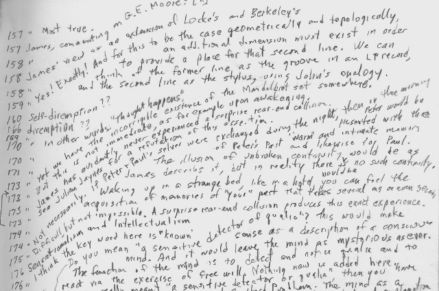 Then one day, a third friend, named Bob, lent me a book and asked me to read it so we could discuss it later. I didn't want to deface his book, so I folded a sheet of paper, stuck it in behind the front cover, and recorded my usual notes on that piece of paper. Instead of marking the passages within the book, I actually counted the lines to the quoted passage and recorded the line number along with the page numbers. I only ever did this for that one book.