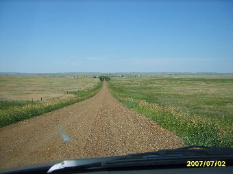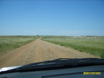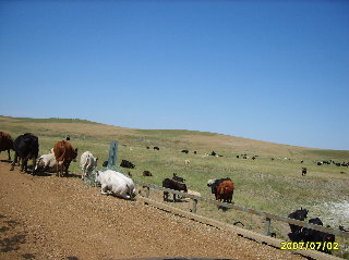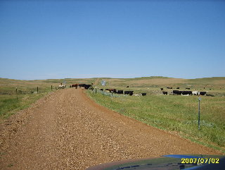 7/2/07 I caught the airport shuttle from home at 3:15 AM to start out a very long day. I flew to Salt Lake City and from there to Rapid City. On that second leg, I talked to a woman who works with the school districts at Pine Ridge. We had an interesting visit. After getting my rental car, I had lunch at a Wendy's in Rapid City before heading north. I decided to take the same road north from Mud Butte that I had taken so many times when I was in college. I figured that this would probably be the last time I would ever take that trip. Mud Butte was gone, so I had some trouble finding the road heading north from 212. The road was still gravel with cattle guards every few miles. I had to stop once to let a herd of cattle get off the road.