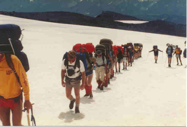 Dave in front, guides to right, hiking to Camp Muir.