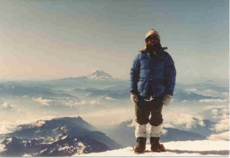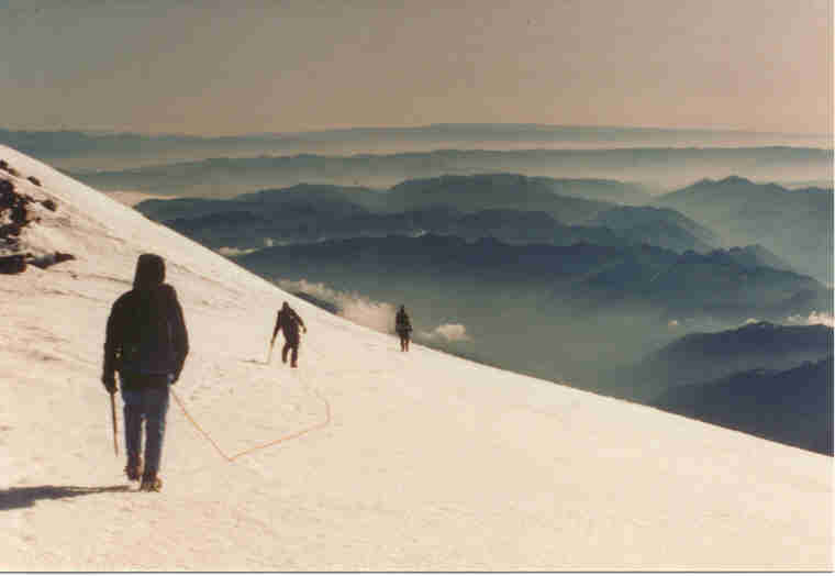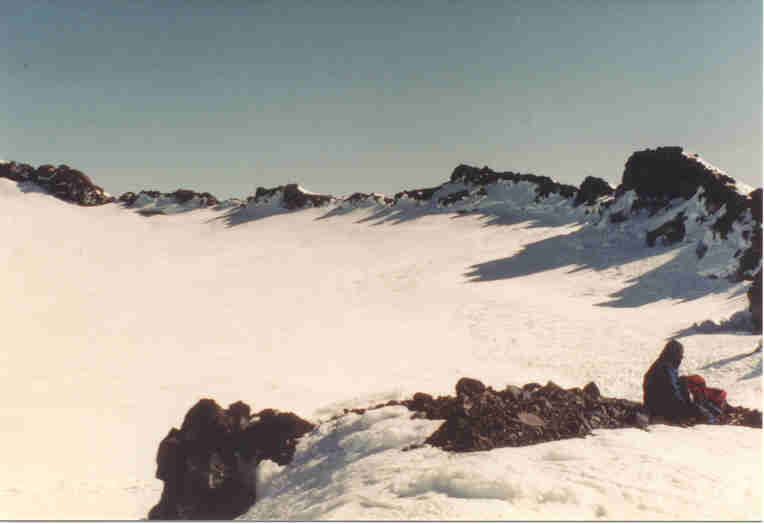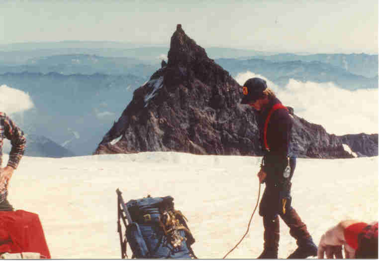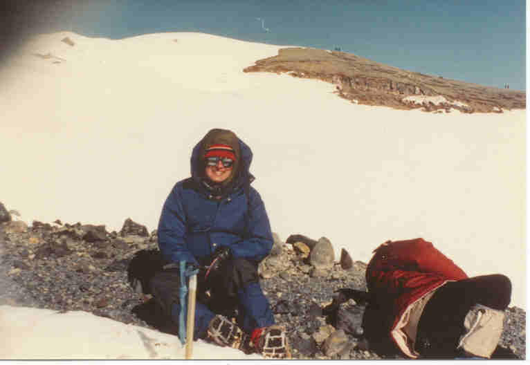Paul smiling anyway (not as sick as the guy lying down). Good picture of crampons and ice axe -- notice my thumb is under the adze, fingers around the pick!