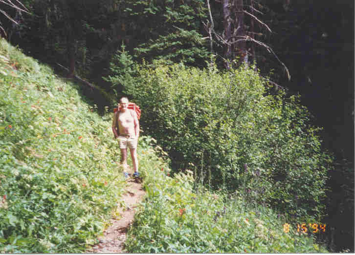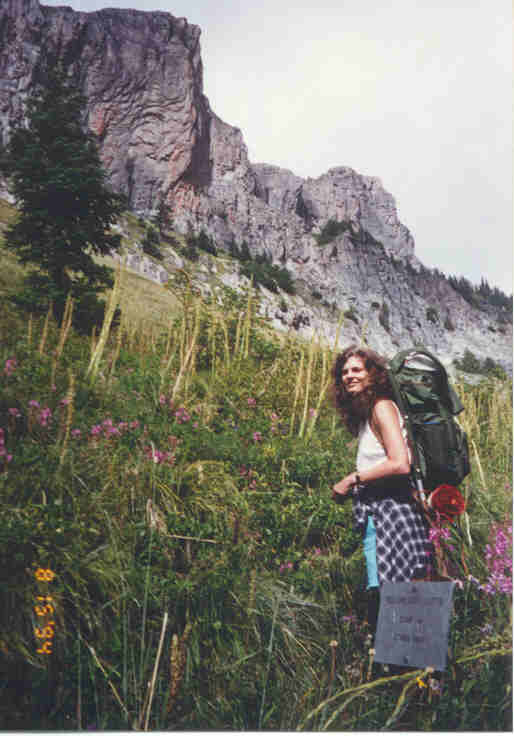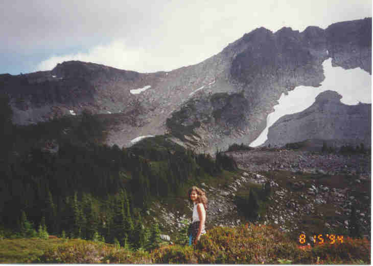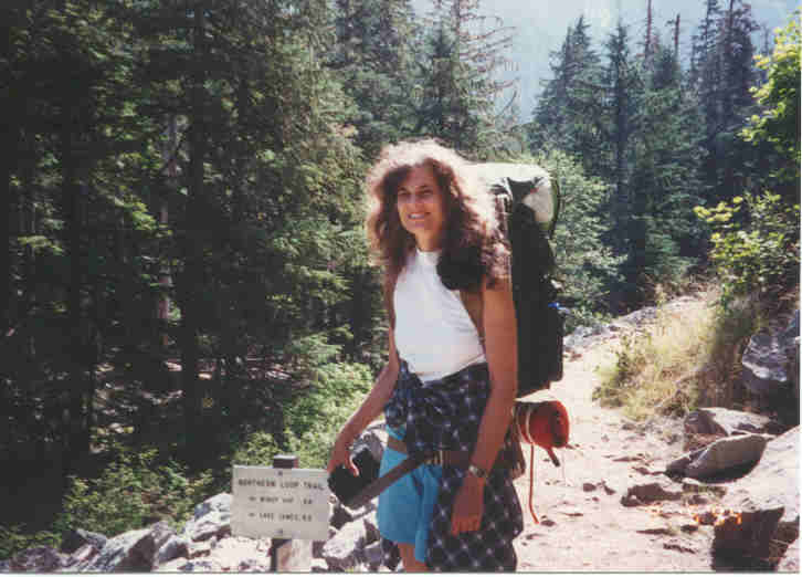 Here is Ellen at the trailhead where the Northern Loop Trail leaves the Wonderland Trail a mile or two out of Ipsut Creek.