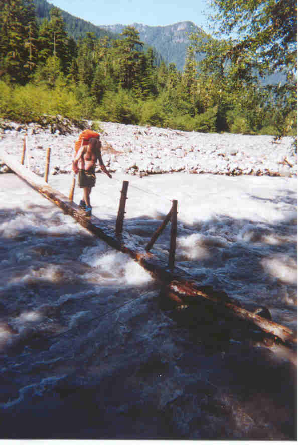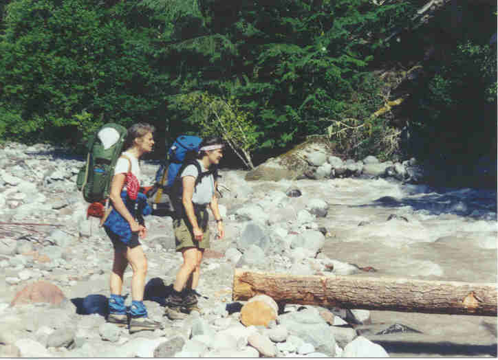 Ellen and Eileen sizing up the lower crossing of the Carbon River. If we could make this crossing, it would save us a couple miles by skipping the big suspension bridge upstream. Paul couldn't remember if he was told this lower crossing was "doable but dangerous" or "safe but scary".