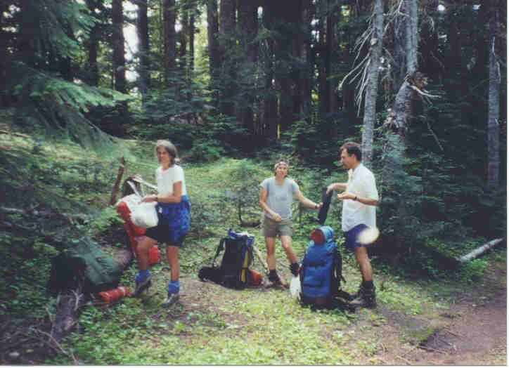 Eileen, Victor, Paul, and Ellen in the Ipsut Creek Campground parking lot looking forward to attempting to hike into Elysian Fields via Windy Gap in Mount Rainier National Park, August 23, 2002.