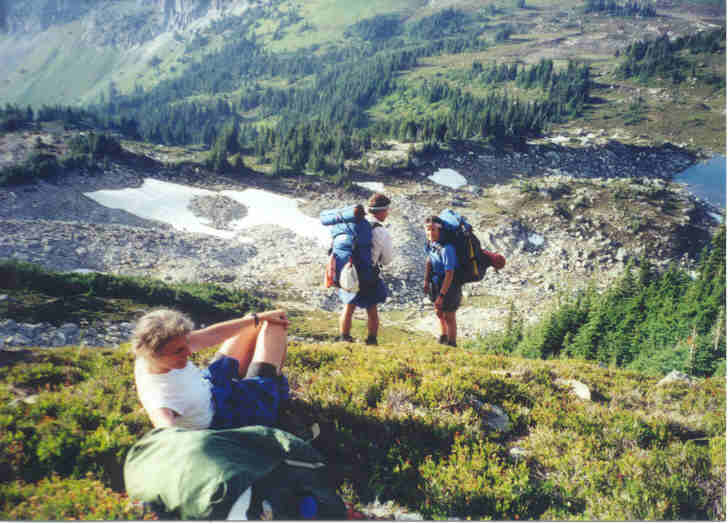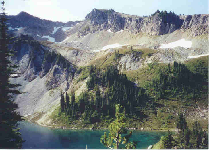 Next morning, we decided to follow another group of hikers who had decided to try a different route after seeing our difficulty the day before. The new route would go to the right of Crescent Lake, seen here, up the knoll to the right of center, then diagonally up to the left to gain the ridge on the horizon to the left of the dark bump at the top left of the picture. We would go below that snowfield up there that we all thought looked like a dragon.