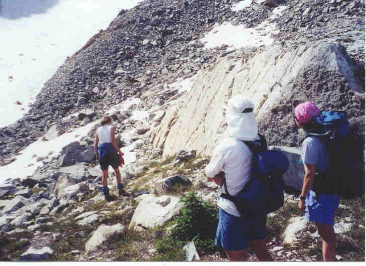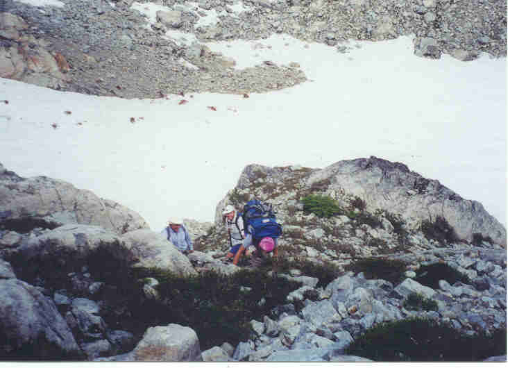 When we got up there, we discovered that we had to cross that snowfield. After some encouragement from the other group hollering from the other side, we did cross it without too much problem.