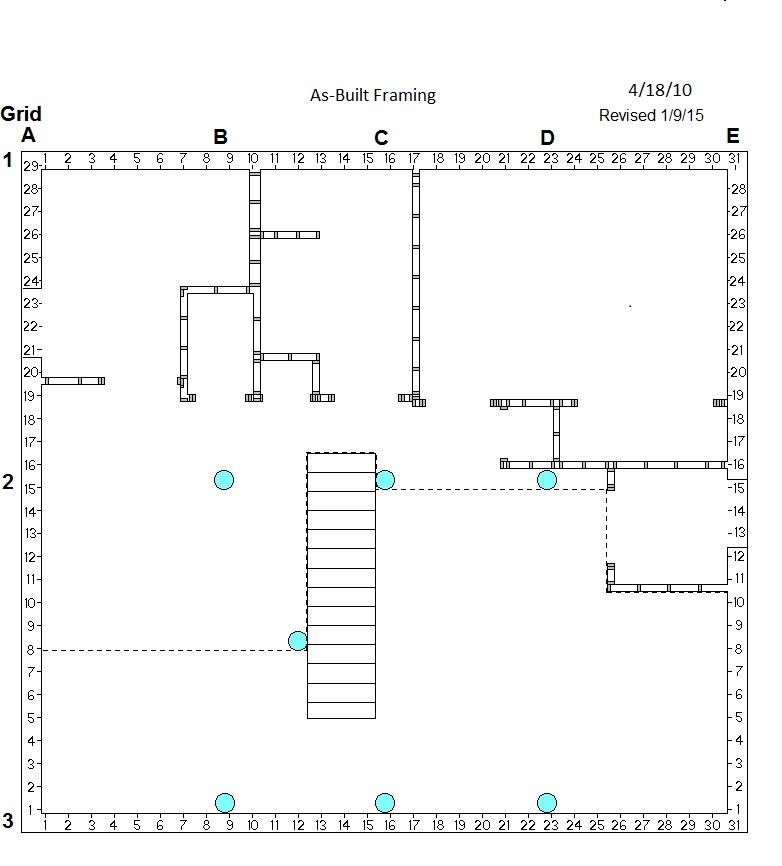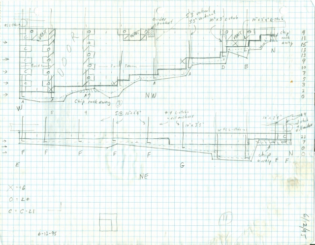 Here you see the complete grid system: the letters going from left to right, and the numbers going from top to bottom. Thus, Grid C2 is the column at the very center of the building. The sizes of the column pads were changed somewhat from those shown on this drawing. The "Concrete block hearth support wall" has not been built, and may not be built for some time. The "Concrete footing" has been poured, but the floor above will be temporarily decked over with a wood stove sitting where a masonry structure may some day be built.
