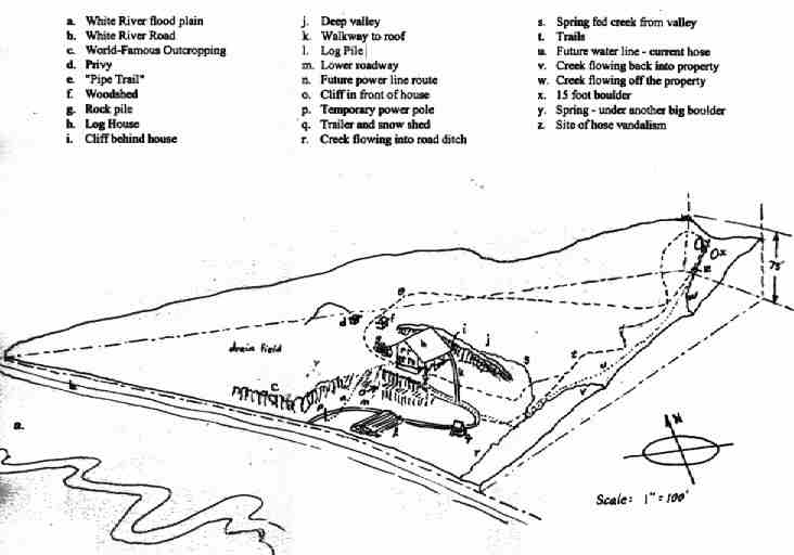 This is a bird's eye view of the property. It is sort of 3-D so you have to imagine the surface of the ground rising in the back. Most of the features drawn in are intended to be on this surface. This drawing explains many of the cryptic terms I use in my journal, so if you are wondering what I mean by, for example, "The Lower Roadway", you can find it on the drawing near the bottom marked with an 'm'. Some features are not marked, however. The "High Rock" is the high point on the cliff, 'i', behind the house. The "Hairpin Turn" is just above and to the right of the trailer, 'q', connecting the Lower Roadway, 'm', with the Upper Roadway, which is not marked with a letter either. The Walkway to roof, 'k', was temporary and used for roof construction. It is no longer there. Neither, for that matter, is the log pile, 'l'.
