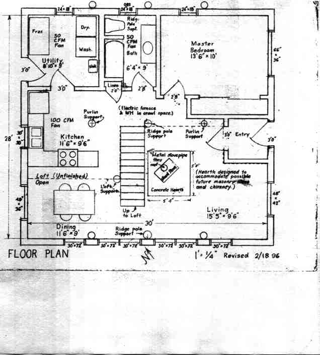 The floor plan has been modified slightly from this drawing. The change is that a pantry has been carved out of the space occupied by the sink in the utility room. By using an over-and-under washer/dryer, it will occupy only the footprint marked "Dry." and the sink will occupy the space marked "Wash." Another change is that the staircase to the loft will be extended two more treads toward the top of the drawing. This will make it a little less steep.