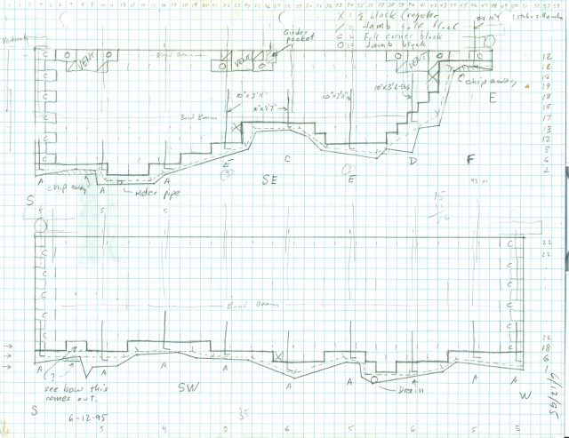 Here you see the footing and foundation elevation drawings for the Grid E and Grid 3 walls. The scale of the drawing is each square is 8 inches on a side. That means that a regular concrete block (CMU) occupies two adjacent squares. The code at the upper right (you may have to zoom in in order to read it) explains the particular type of block used. A Jamb block has a 1"x1" vertical slot in the center of an otherwise flate face on one end of the block. A corner block has one end that is completely flat. Unmarked squares contain half of a standard block. The pattern of block overlap is established by the drawing of the block orientation at the corners.