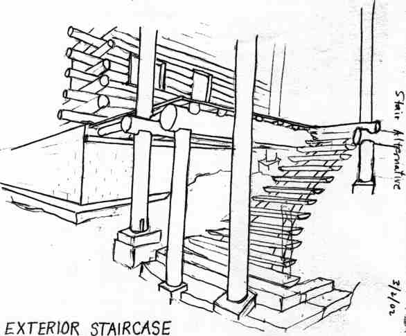 This is just a sketch representing the latest ideas on what the exterior staircase will look like. Of course, the finished staircase and deck will include handrails and balusters. The bottom few stair treads will be made of stone. They will be covered with snow in the winter, and they will stick out beyond the drip line of the roof. In the winter, all the snow piles up to the right side of this picture, so even in the deepest snow, there will be clear access to the stairs from the left side.