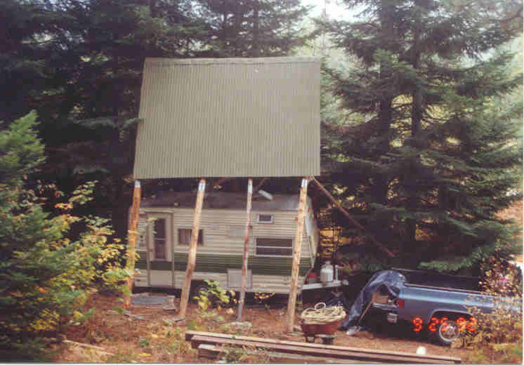 The major projects for 1992 were road building and installing the trailer with a protective roof. Here the trailer is in its final location. I have a handkerchief tucked in my hat to prevent sunburn.