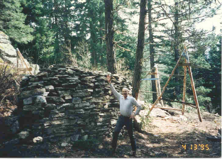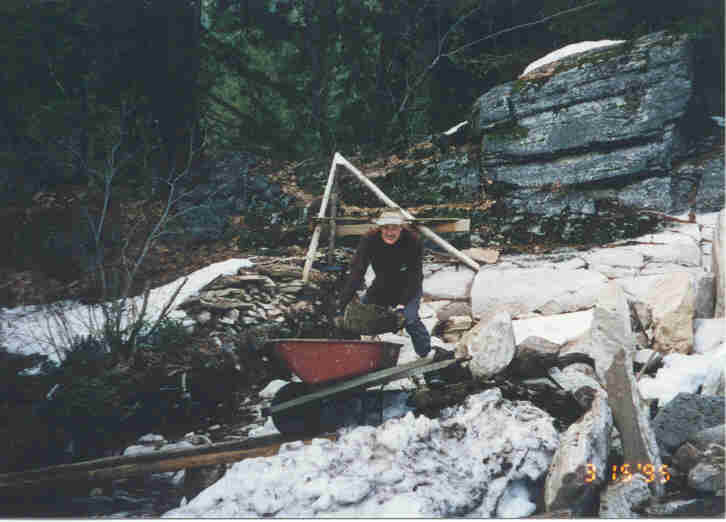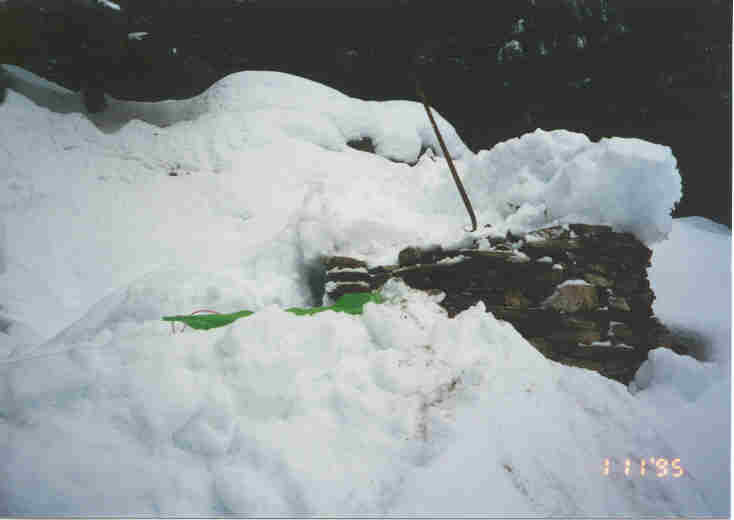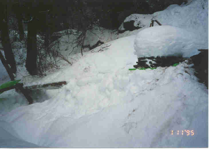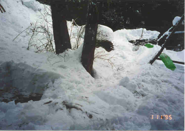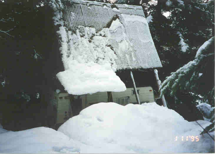 The major projects for 1995 were to design the building, to get the building permit, and to pour the footings. When I wasn't working outside during this winter, I was in the trailer drawing the plans, or on the phone trying to figure out what I needed to do in order to get the building permit. The snow got pretty deep by January. Here it is almost to the top of the trailer where it slid off the snowshed.