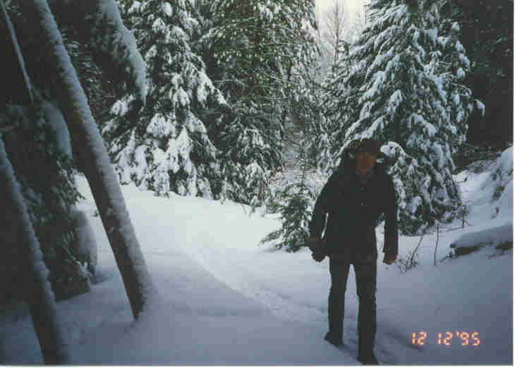 When it got too cold to do masonry work, I began stockpiling concrete blocks in the building site. I would haul 30 or 40 blocks up there in my pickup each week and then carry them up to the building site from the pickup parked just off the White River Road. Here you see me carrying one in my Trapper Nelson backpack up past the trailer.