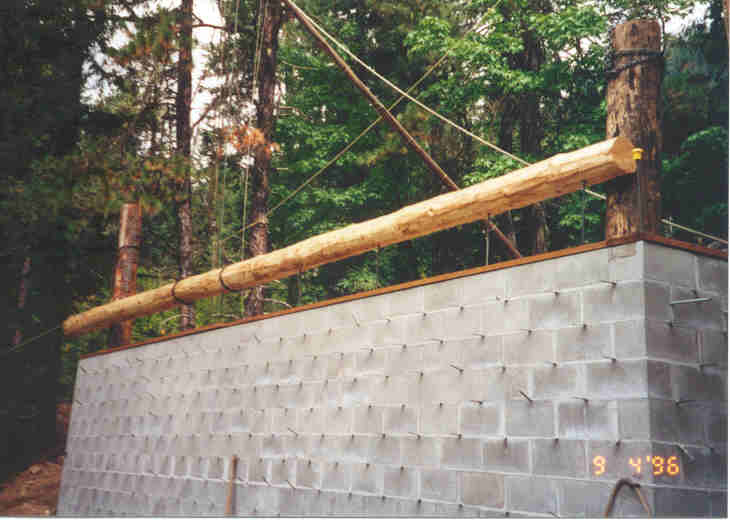 Lowering the very first log in place. All those rebar sticking up need to go into holes bored in the log. It took me a couple times to get it right.