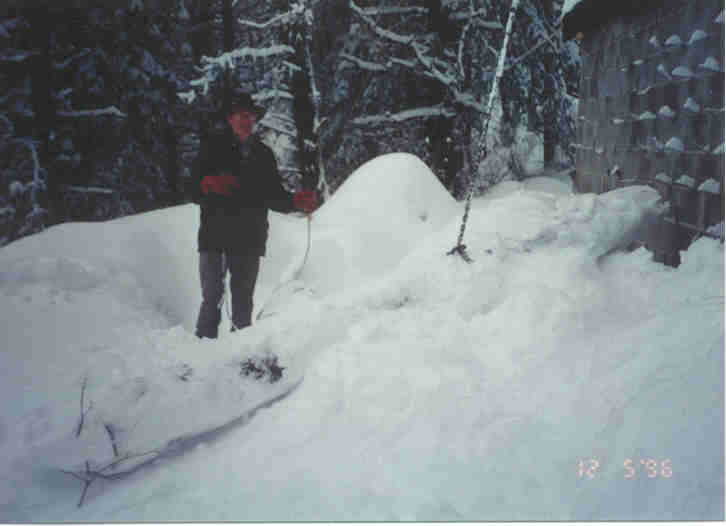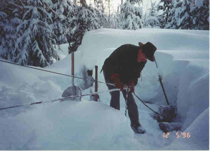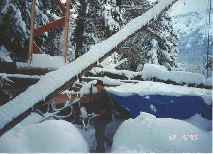The log has been pulled up and I am now maneuvering it into position on the upper roadway. The log is so covered with snow that you can barely make it out. At this point, it is still hanging from the crane choked at its center of gravity so it is easy for me to move.