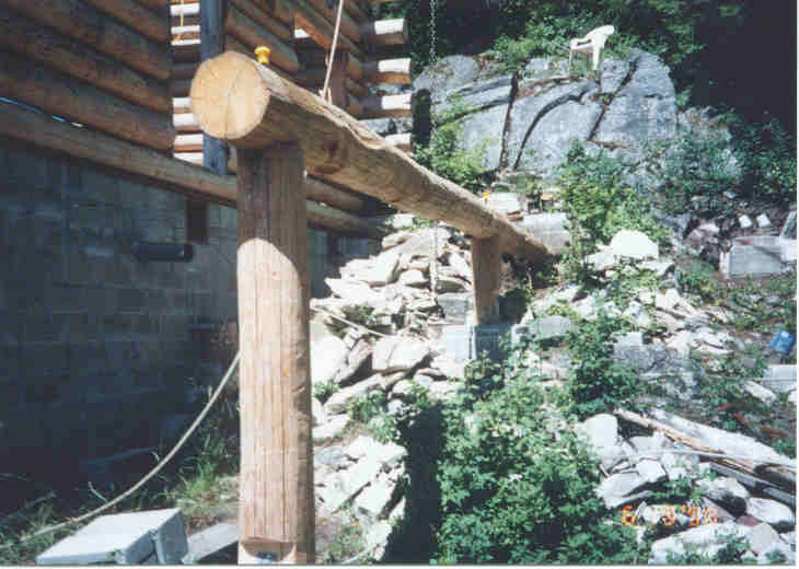The main porch beam is in place. The commander's chair at upper right.