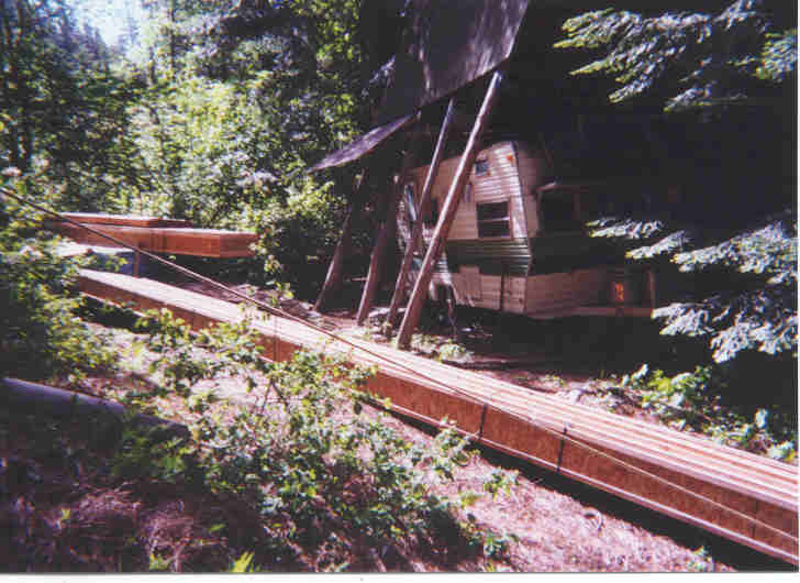 Some 40-foot rafters are staged part way up the roadway. I stopped doing that after a while. (If you are interested in how I eventually installed these rafters, take a look at my ninety step procedure.)