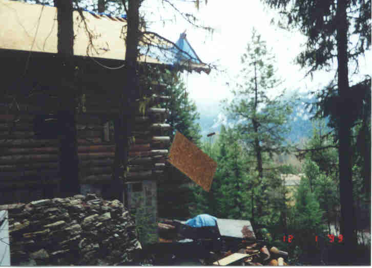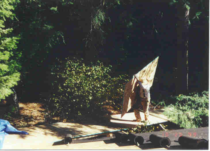 The last sheet of OSB going up to the small roof. I used a block and tackle to hoist them up instead of carrying them up the walkway and up and over the big roof as I had planned. The reason was that I kept the big roof tarped and it was too slippery to walk on. It was too much of a hassle to move the tarps and then replace them every time I worked on the small roof. This way, the tarps just stayed down.