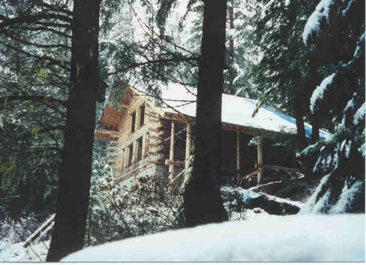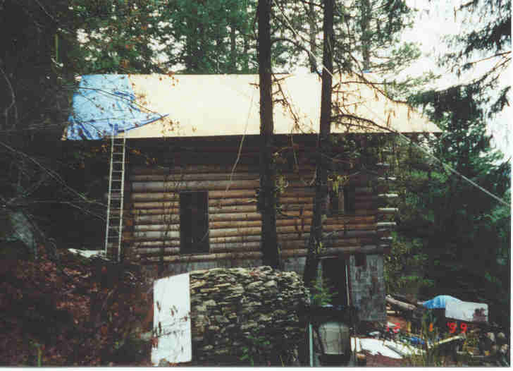 The sheathing of the small roof was finished literally minutes before the first snowfall. It started raining as I was nailing down the last sheet, and by the time I got the tarps pulled over it, the rain was turning to snow. Now that's close timing.