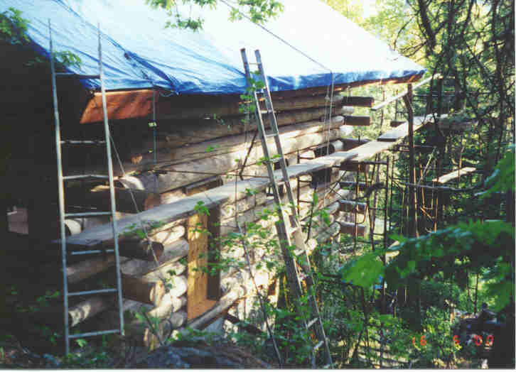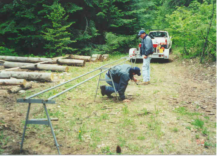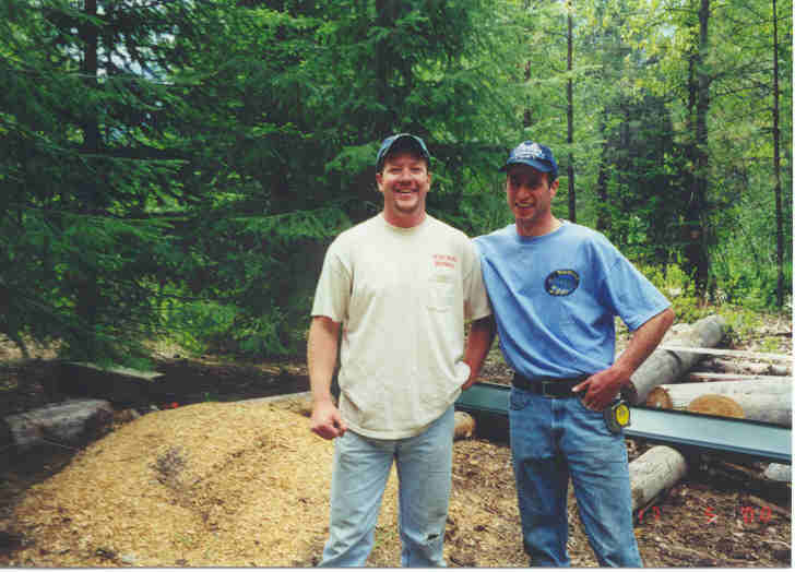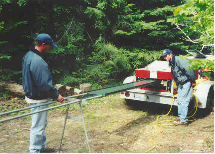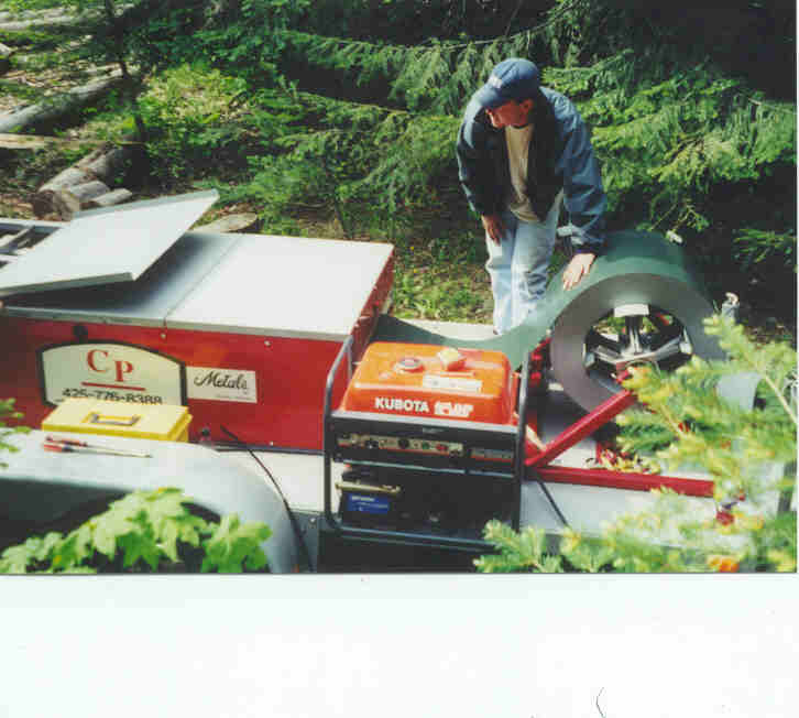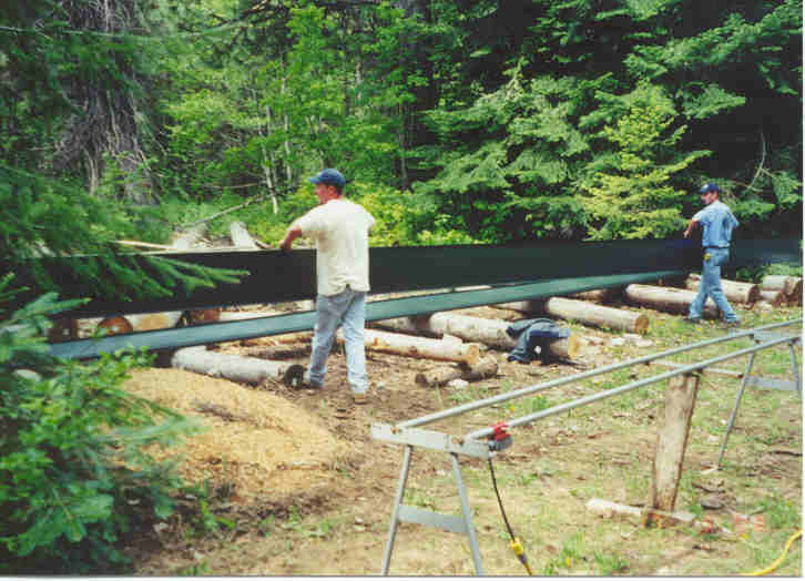 Sean and Mike from CP Sheet Metals setting up to make the steel roof panels. The log rack on the left is set up to hold them.