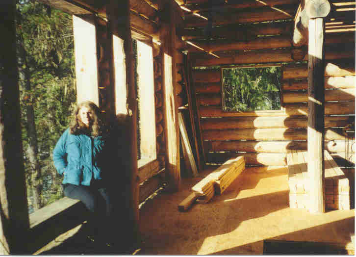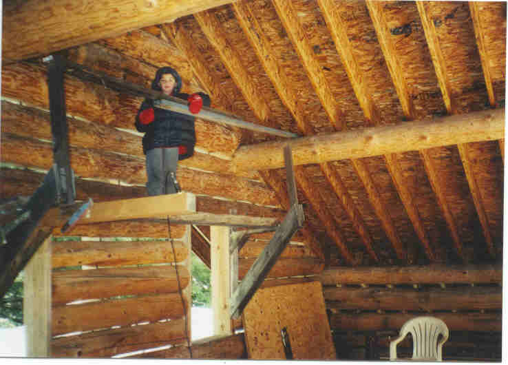 Andrew in the loft on the scaffolding left from building the gable wall. 1/14/01