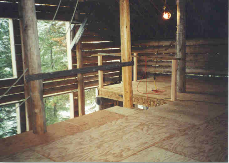 The loft subfloor is finished.The stairway will come up directly below the light bulb. 1/25/01