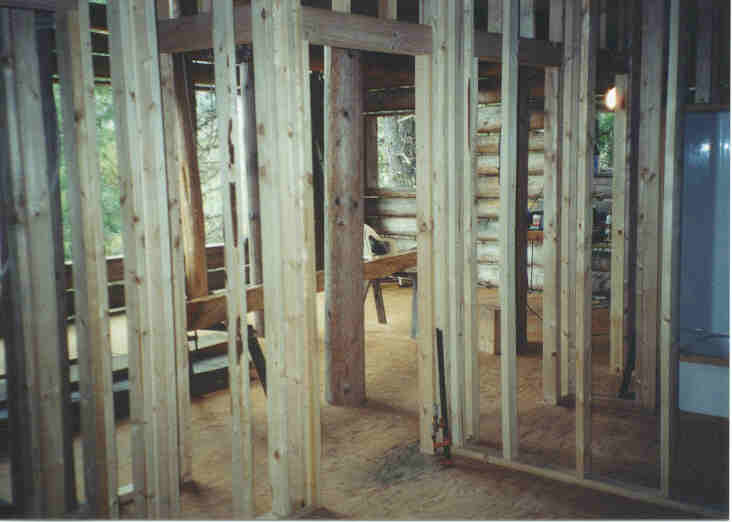 View of the interior stud walls from the bedroom looking toward the dining room. You can see the tub and shower on the right. 4/4/01