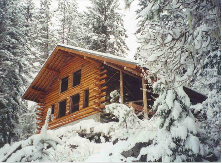 The Grid F.5,3 post for the porch beam is barely visible here between the trees. It is just to the right of center in the picture. The snow had blown into the cracks in the log walls and it looks like I hoped the chinking would someday look. 11/28/01