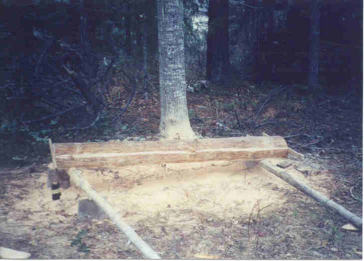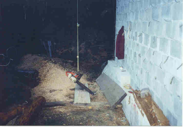 This is the gwiz station. Once the planks are ripped, they are skidded down here. This is where I gwiz them with this gwizard. ("Gwizard" is my contraction of "Log Wizard", which is the commercial name of the 3 1/4" planer attachment you see mounted on the end of the chainsaw bar. I also coined the verb "to gwiz" meaning to operate the gwizard so as to make a draw-knife-like finish on a log or plank.) I hang the gwizard from a sling attached overhead. The sling has an adjustable knot on it so I can easily adjust the height of the gwizard. The sling carries most of the weight of the saw so that I can direct my efforts to keeping it aligned and moving properly as well as controlling the RPMs of the saw. There are a lot of things to pay attention to when gwizzing, and it takes a while to get the hang of it. After going through two complete sets of blades and one set of bearings, I can say that I have gotten the hang of this thing, and I am pretty good at gwizzing.