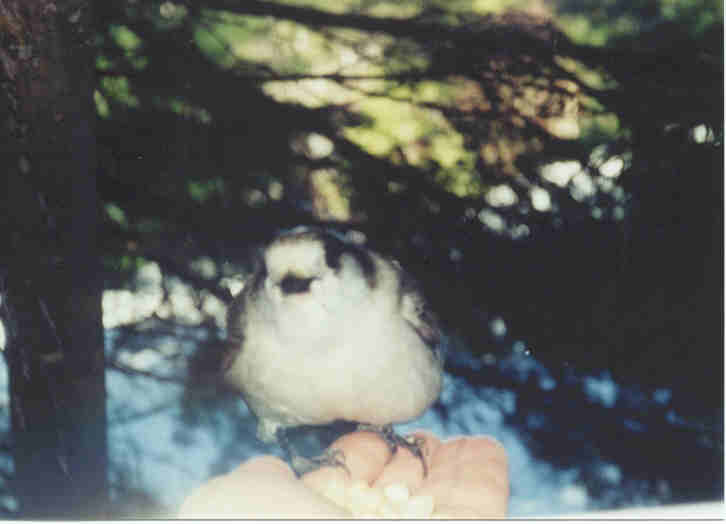 Here is my friend, Scruffy, the gray jay again. He is at the window of the trailer getting peanuts and I got this shot showing the lump above his left leg. He hurt that leg somehow, but it seems to be ok now except that Scruffy's body looks asymmetrical with that bulge.