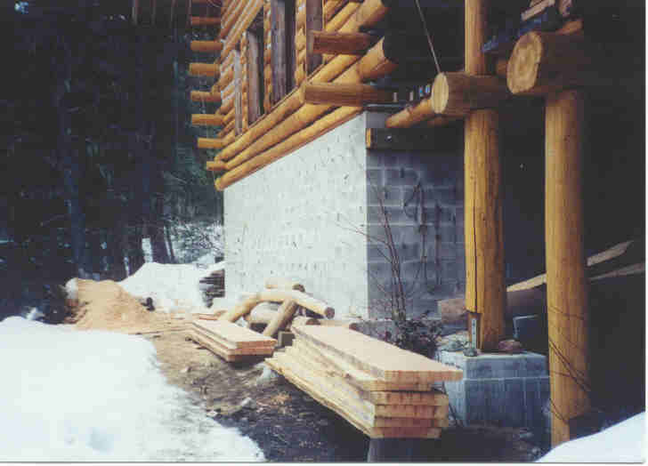 Here are the last nine planks, ripped and gwizzed, ready to be hoisted up to the deck above. You can see a couple of slabs, also gwizzed, under the porch to the right, and another couple slabs can barely be seen back at the gwiz station. The six-foot eaves overhead are what keep that area next to the building free of snow and give me a nice dry working area.