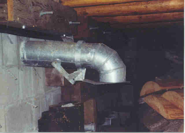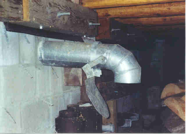 This is a picture of my one-way rodent valve with the flap closed. The idea is that rodents can exit the building through the pipe but they can't get back in that way. - 3/17/04