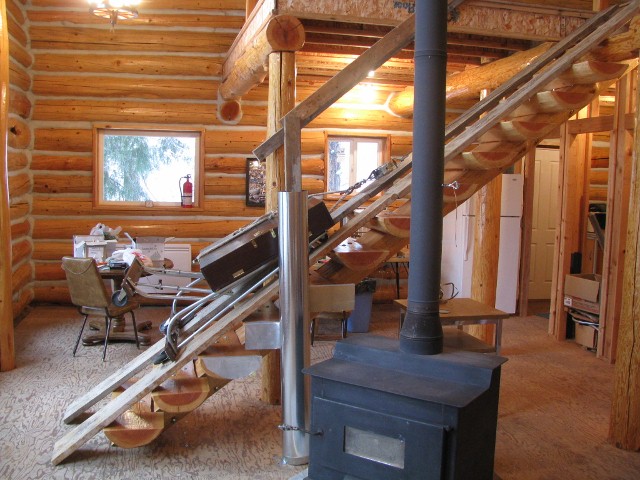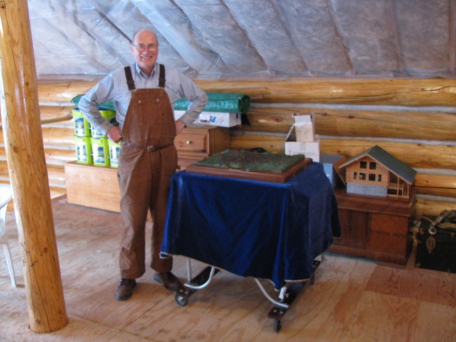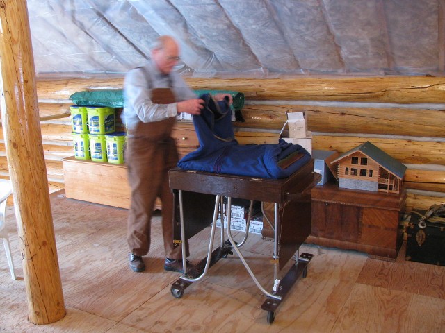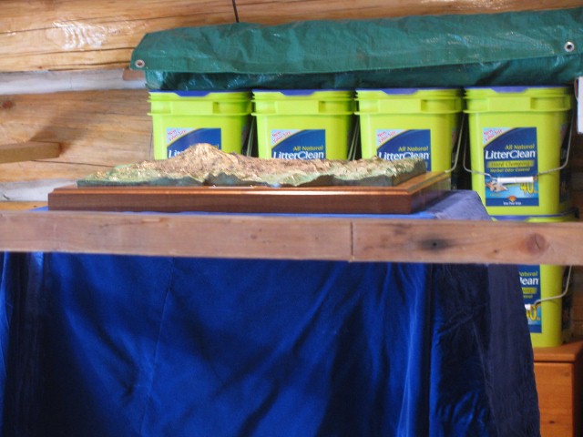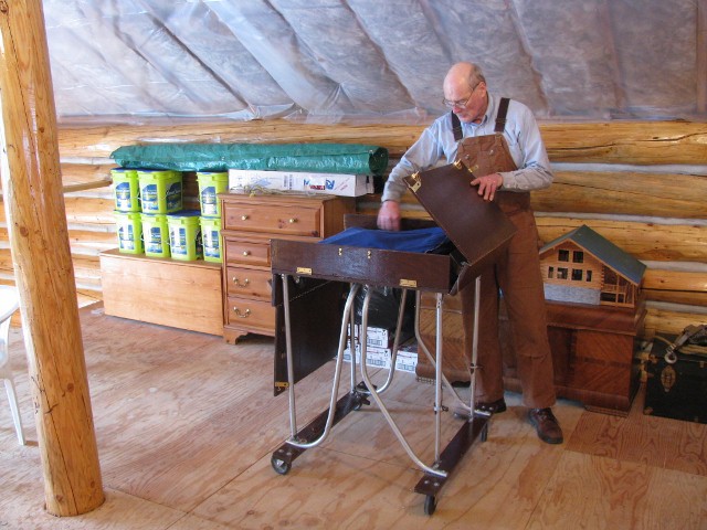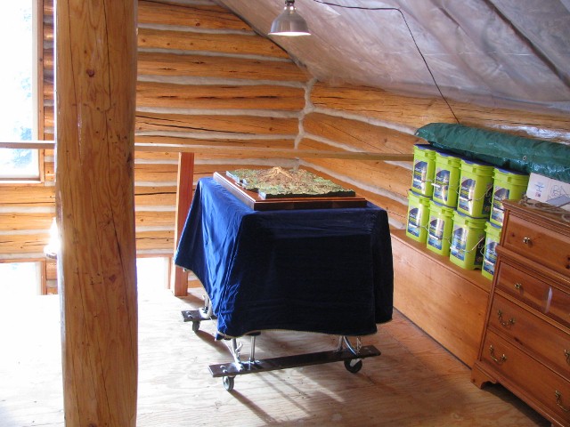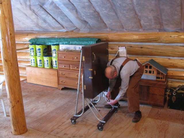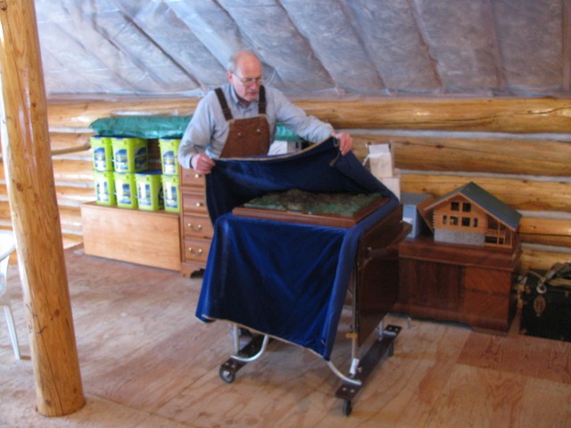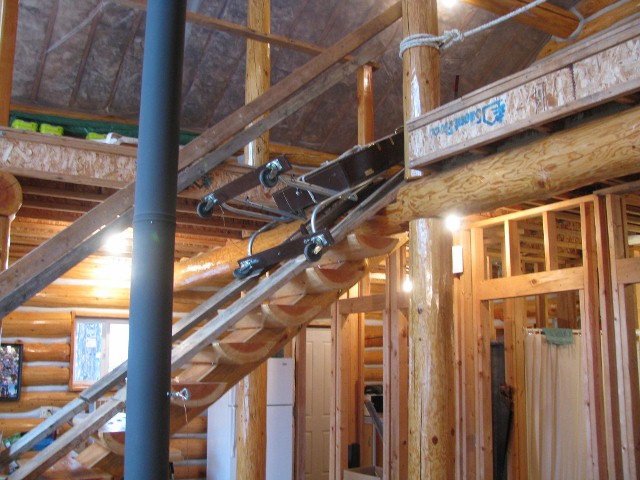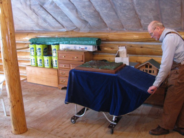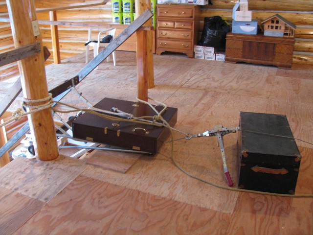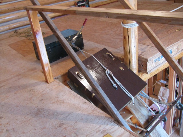 12/22/10 Getting the 80 lb. bronze model of Mt. Rainier National Park up to the loft was a fairly big deal. Here it is just starting on its way up being winched along by a come-along.