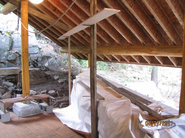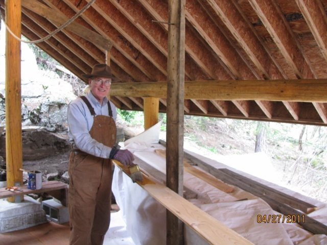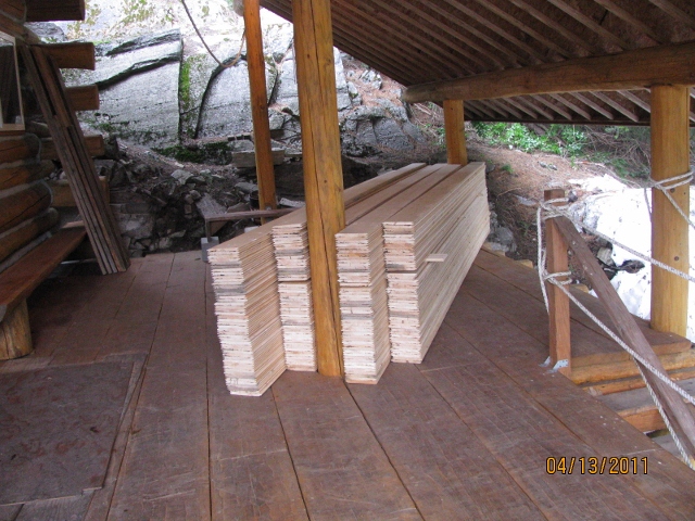 4/13/11 The tongue and goove 1x8 pine paneling boards are stockpiled on the front porch awaiting varnish or stain before they will be installed on the ceilings inside and out.