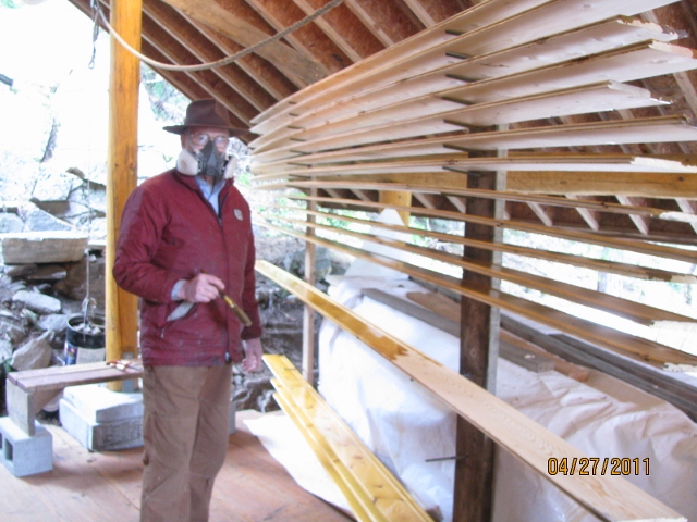 5/11/11 Paul staining one of the vent boards for the ceiling.
