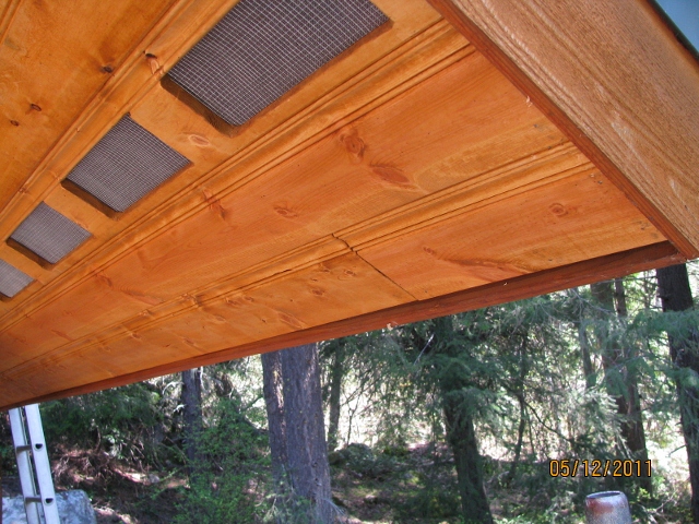 5/12/11 The first four courses of ceiling boards are installed on the front porch ceiling.