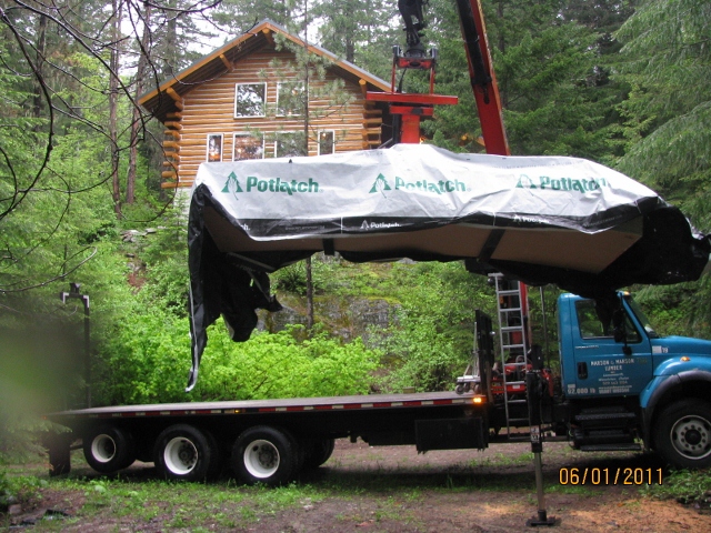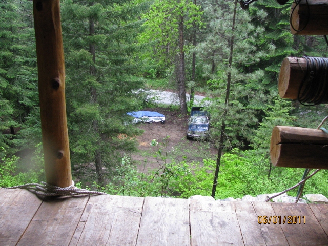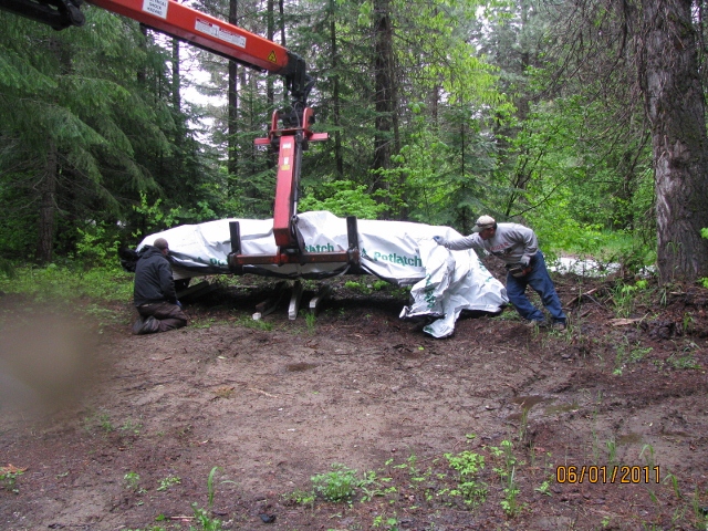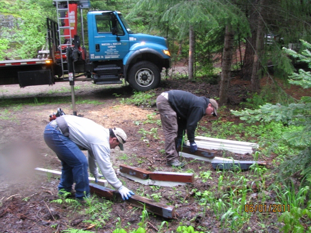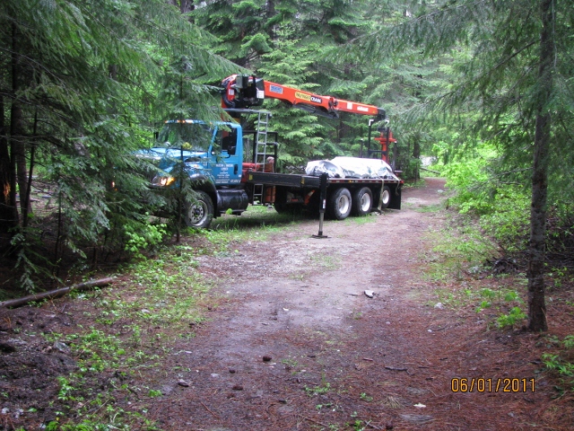 6/1/11 The drywall load is on the ground in the lower parking area covered with tarps. My truck is parked off to the side to make room for Mike to get his front loader in to pick up the drywall and bring it up to the cabin.