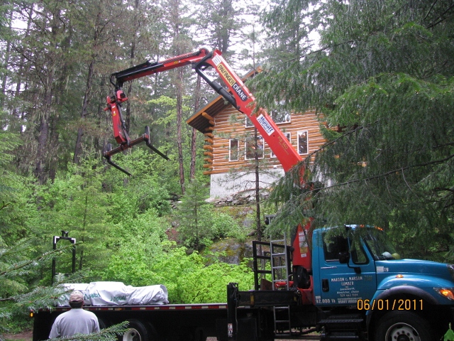 6/1/11 The boom with the forks is moving to pick the load up from off the truck bed.