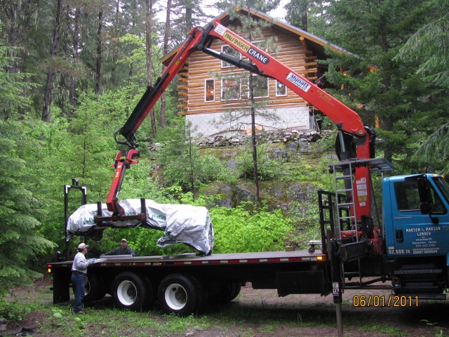 6/1/11 The delivery truck arrives on the lower roadway with the load of 30 12-foot sheets of drywall and 8 boxes of drywall mud.