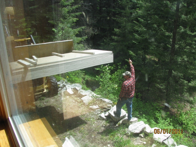 6/1/11 Here the load of drywall is arriving at the upper roadway on a set of forks sticking out from the bucket on Mike's front loader.