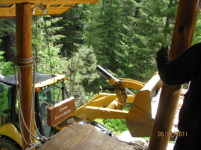 6/1/11 It is a very close fit. The 12-foot wide load barely fit between the trees and brush around the hairpin turn, and at the top, the load barely brushes the porch deck with the loader's wheels at the edge of the roadway. Fortunately the Camp Serendipity sign did not have to be moved. The load and bucket went under it, and the tractor stopped just short of it as you can see. The bucket was able to be raised to porch height without hitting the sign, although the bucket boom just missed the sign. It was a perfect fit with almost no slack.