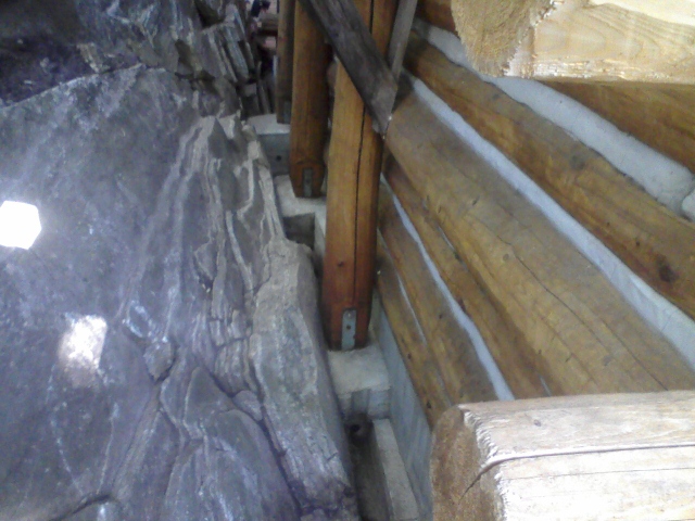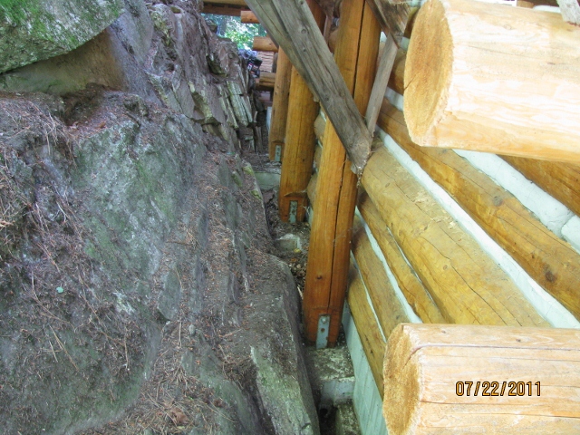 8/6/11 Here's a view of the freshly poured concrete at the back of the cabin between Grid D1 and E1. My foot shown standing on a rock ledge in the cliff at the lower left gives you an idea of what you are looking at. The number of logs in the wall at the right shows how deep and narrow that space is.